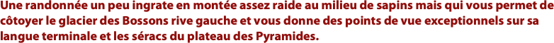 ![]() Chalet des Pyramides![]() ![]() © GEOPORTAIL ![]() ![]() Au parking des Bossons, emprunter le télésiège qui vous amène aux abords du glacier des Bossons (1425m). (Vous pouvez également monter à pied jusqu’au chalet du Glacier des Bossons en 1h environ et 250m de dénivelé en plus mais peu d’intérêt). Il vous dépose au chalet du Glacier des Bossons d’où l’on profitait de la terrasse (jusqu'en 2011) de la vue sur la langue terminale du glacier. Une exposition sous forme de sentier thématique bordé de panneaux relate l’histoire du glacier. Le chalet est le point de départ pour la randonnée au chalet des Pyramides. Le sentier monte régulièrement en lacets dans la forêt. Des trouées dans les bois permettent des points de vues réguliers sur le glacier. On atteint le chalet des Pyramides en 1h30 environ, après une montée un peu fastidieuse. Il y a peu d’emplacement pour pique-niquer aux abords du glacier dans ce cadre unique qui offre une vue saisissante sur la cascade des séracs du glacier. Vous pouvez aussi vous restaurer au chalet des Pyramides. La descente s’effectue par le même itinéraire. Du chalet des glaciers des Bossons, vous pouvez prendre le télésiège ou redescendre jusqu’au parking par le chemin des Monts, petit hameau situé au-dessus des Bossons et les pistes de ski en 30mn. À partir du chalet des Pyramides, les randonneurs expérimentés pourront continuer en direction de la Jonction (2589m). Le sentier emprunte la Montagne de la Côte et vous amène aux portes de la haute montagne, avec un point de vue grandiose sur les glaciers des Bossons et de Taconnaz, situés de part et d’autre. Cet itinéraire fut emprunté par Jacques Balmat et le docteur Paccard lors de la première ascension au Mont Blanc en 1786. Compter 4h pour atteindre la Jonction depuis l’arrivée du télésiège des Bossons et 3h pour la descente. © Reproduction interdite | ||