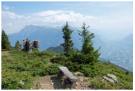 ![]() Mont de l'Arpille (Col de la Forclaz)![]() ![]() ![]() ![]() Depuis le col de Forclaz, le départ du sentier s’effectue en lisière de forêt côté suisse, derrière l’hôtel-restaurant du Col de la Forclaz et le camping. Au bout de 10mn, le sentier se sépare en 2 itinéraires qui rejoignent le sommet, prendre à l’aller le sentier de droite en direction de Sex Meylan. Le sentier monte en lisière de forêt en offrant des vues sur le glacier du Trient. Puis la montée devient soutenue et ingrate en forêt. En 50mn, on rejoint une clairière avec une croix. Au bout d’une heure (depuis le départ), des vues apparaissent sur la vallée du Rhône et les sommets suisses. 10mn plus tard, on sort enfin de l’étage forestier. Belles vues sur l’alpage de l’Arpille avec ses chalets en contrebas, Martigny et la vallée du Rhône. Après une dernière montée un peu rude de 25mn, on rejoint l’intersection qui redescend au Col de la Forclaz. Le Mont de l’Arpille (2085m) est à 5mn sur votre droite. Table d’orientation avec tour d’horizon à 180°(de gauche à droite) sur les alpes vaudoises, bernoises, valaisannes, le Grand Combin, le massif du Mont-Blanc et le massif des Aiguilles Rouges. Compter 1h45 pour rejoindre le Mont de l’Arpille depuis le col de la Forclaz. Le retour s’effectue en boucle avec 2 possibilités·: - Version courte par Plan du Gy/Le Sex Peu après le départ, on traverse une grande clairière avec pelouse alpine parsemée de mélèzes et épicéas, offrant des vues sur le Mont-Blanc, le glacier et l’aiguille du Tour. Après 20mn, on rejoint la lisière de forêt. La 1ère partie de la descente est sympathique, avec de belles vues sur le Mont-Blanc, les glaciers du Tour et du Trient, le village du Trient en contre-bas. La 2ème partie de la descente en forêt est pénible, sans surprise. On regagne le parking en un peu plus d’une heure depuis le Mont de l’Arpille, soit un peu moins de 3h pour la boucle complète.