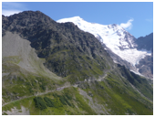 ![]() Nid d’Aigle – Baraque des Rognes – Glacier de Bionnassay![]() ![]() © GEOPORTAIL ![]() ![]() À l’arrivée du téléphérique, dirigez-vous en léger contrebas vers la gare Tramway du Mont-Blanc de Bellevue. Empruntez le Tramway du Mont-Blanc pour vous rendre au Nid d’Aigle, gare terminus. Attention à bien faire correspondre les horaires du téléphérique de Bellevue et les horaires du Tramway du Mont-Blanc. De plus, compte tenu de l’affluence à certains horaires, il est nécessaire d’avoir une carte numérotée qui indique le train à prendre. La ligne du Tramway du Mont-Blanc construite entre 1904 et 1914 devait atteindre le sommet du Mont-Blanc ! Elle a été interrompue au Nid d’Aigle qui est devenu le point de départ de l’ascension du Mont-Blanc par la voie classique. Montez au dessus de la gare du Nid d’Aigle (2372m). Vous pouvez commencer par un aller-retour jusqu’au belvédère du glacier en empruntant le chemin sur la droite. Revenir sur vos pas puis commencez votre ascension sur les pentes raides et caillouteuses qui mènent au col des Rognes et à sa cabane. Le sentier monte en lacets serrés dans la combe aride du désert de Pierre ronde. Après avoir franchi le col des Rognes, on arrive au replat de la baraque des Rognes et ses nombreux bouquetins. Vue imprenable sur l’aiguille du Goûter et son refuge. Faire demi-tour et emprunter le même itinéraire jusqu’au Nid d’Aigle. Avant d’arriver à la gare du Nid d’Aigle, prendre le sentier qui plonge à gauche vers la rive droite du glacier et la combe de l’Are. Le retour commence par une descente sportive dans les escarpements rocheux qui longent le glacier de Bionnassay et sa moraine, en dominant les séracs et les crevasses, impressionnants. Le sentier, parfois aérien est bien équipé : deux courts passages sur des échelles, une main courante et enfin des marches métalliques permettent de franchir les barres rocheuses. Puis la pente s’adoucit dans la combe de l’Are. Après la langue terminale du glacier, vous franchissez un torrent. Laissez sur la gauche le sentier en direction de la passerelle du Glacier et du Col du Tricot. On arrive aux alpages de l’Are et à leur chalet, à l’entrée de la forêt et du vallon de Bionnassay. Laissez sur la gauche le sentier en direction de Bionnassay et continuez, après avoir franchi un portillon, dans une partie boisée vers la gare de Bellevue. © Reproduction interdite | ||